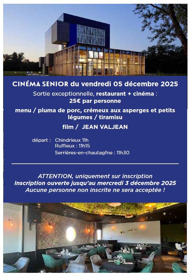 Restaurant et cinéma = 25€ par personne, transport compris depuis Chindrieux, Ruffieux ou Serrières en Chautagne.