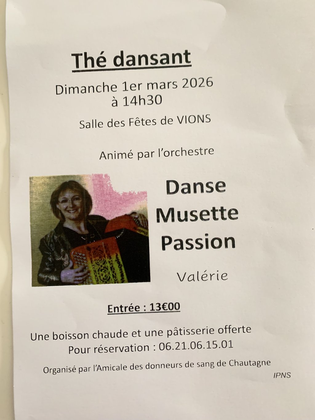 L'Amicale des Donneurs de sang organise son thé dansant le dimanche 1er mars 2026 à la Salle des fêtes de Vions à partir de 14h30.